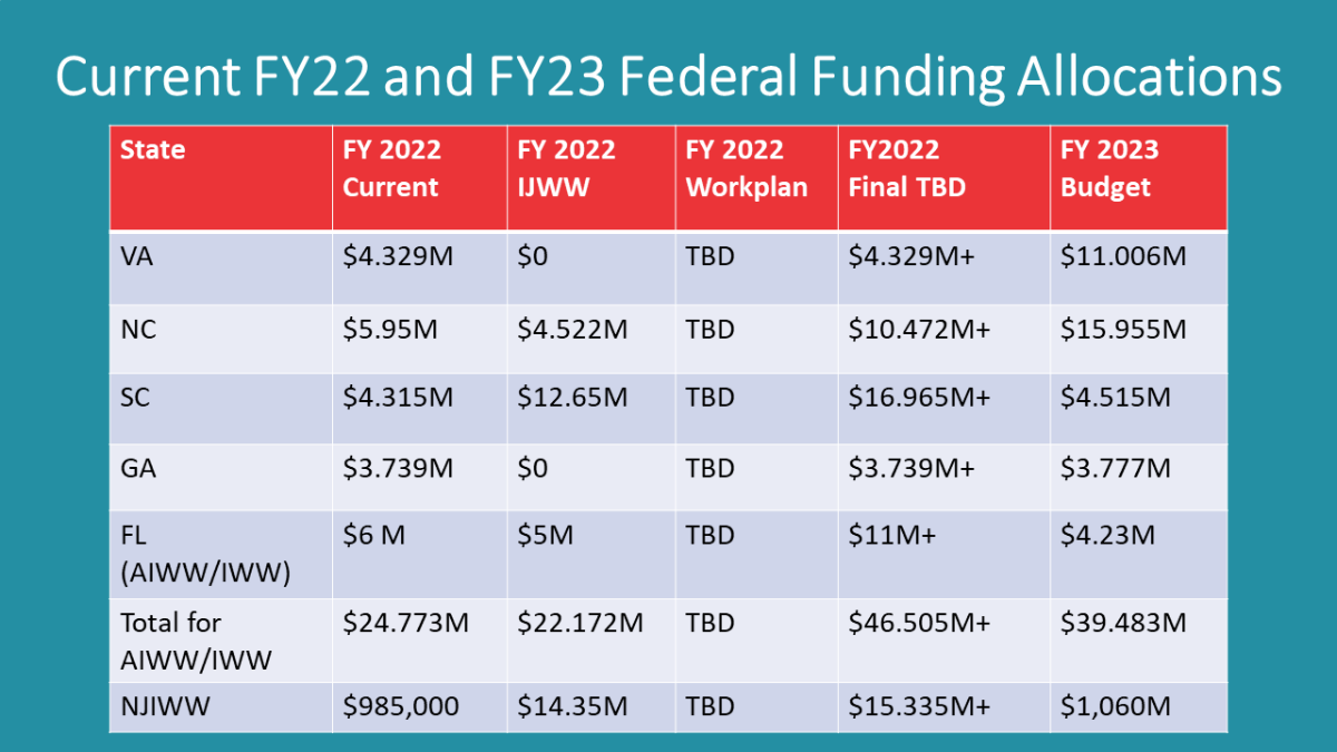 This week, we learned that we have not received funding for the AIWW/IWW in the FY23 allocation of the IIJA and $151,000 for the NJIWW. This is not surprising when compared with the funding we received in year one and the President’s FY23 Budget discussed next!
