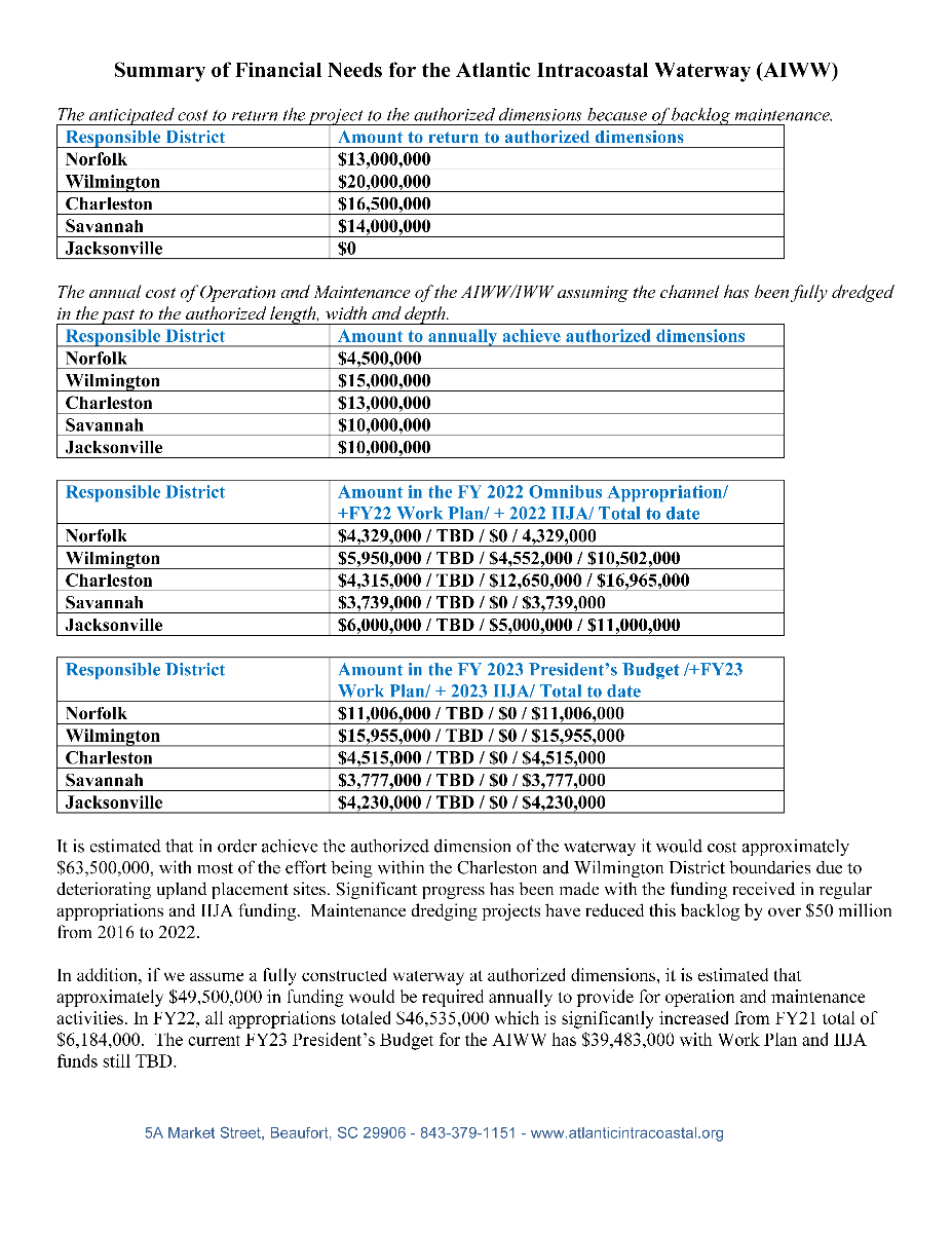 Their summary is offered below:“It is estimated that in order to achieve the authorized dimension of the waterway it would cost approximately $63,500,000, with most of the effort being within the Charleston and Wilmington District boundaries due to deteriorating upland placement sites. Significant progress has been made with the funding received in regular appropriations and IIJA funding. Maintenance dredging projects have reduced this backlog by over $50 million from 2016 to 2022.In addition, if we assume a fully constructed waterway at authorized dimensions, it is estimated that approximately $49,500,000 in funding would be required annually to provide for operation and maintenance activities. In FY22, all appropriations totaled $46,535,000 which is significantly increased from FY21 total of $6,184,000. The current FY23 President’s Budget for the AIWW has $39,483,000 with Work Plan and IIJA funds still TBD.”