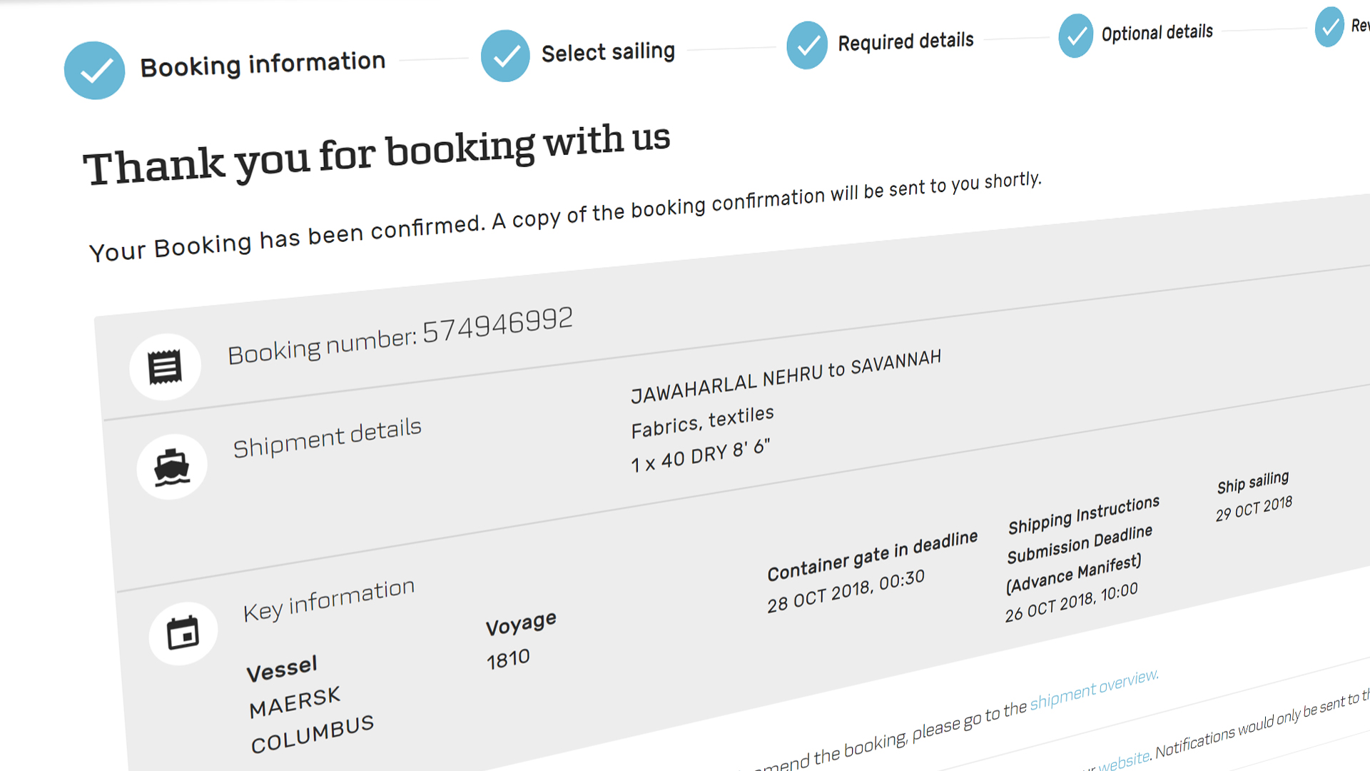 Instant booking confirmation is available in beta for all customers through the online booking modules of the Maersk Line, SeaLand and Safmarine brands. The functionality currently covers dry cargo shipments. Refrigerated cargo, dangerous cargo (IMDG) and inland container yards are expected to be added during 2019.