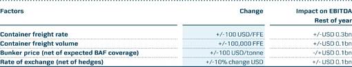 A.P. Moller – Maersk’s guidance for 2018 depends on several factors. Based on the expected earnings level and all else being equal, the sensitivities for the rest of 2018 for four key assumptions are listed in the table below: