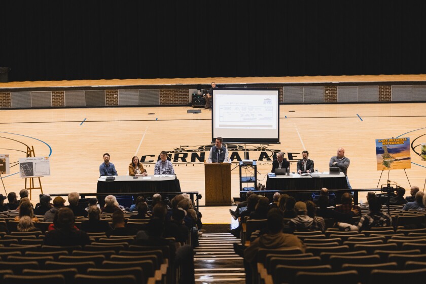 Mitchell’s Joe Schroeder speaks to the crowd at the Lake Mitchell information meeting on Tuesday, March 19, 2024, at the Corn Palace.