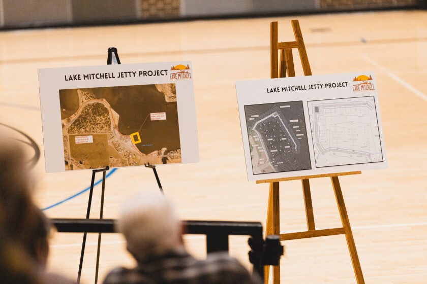 Signs of the Lake Mitchell jetty project are set up on display at the Lake Mitchell information meeting on Tuesday, March 19, 2024, at the Corn Palace.