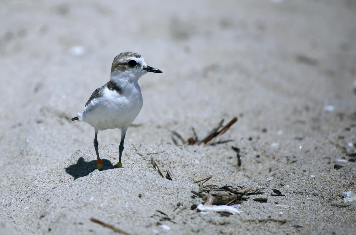 An endangered Western snowy plover parent keeps a close watch on its chick on the Huntington Beach side of the mouth of the Santa Ana River in 2020.