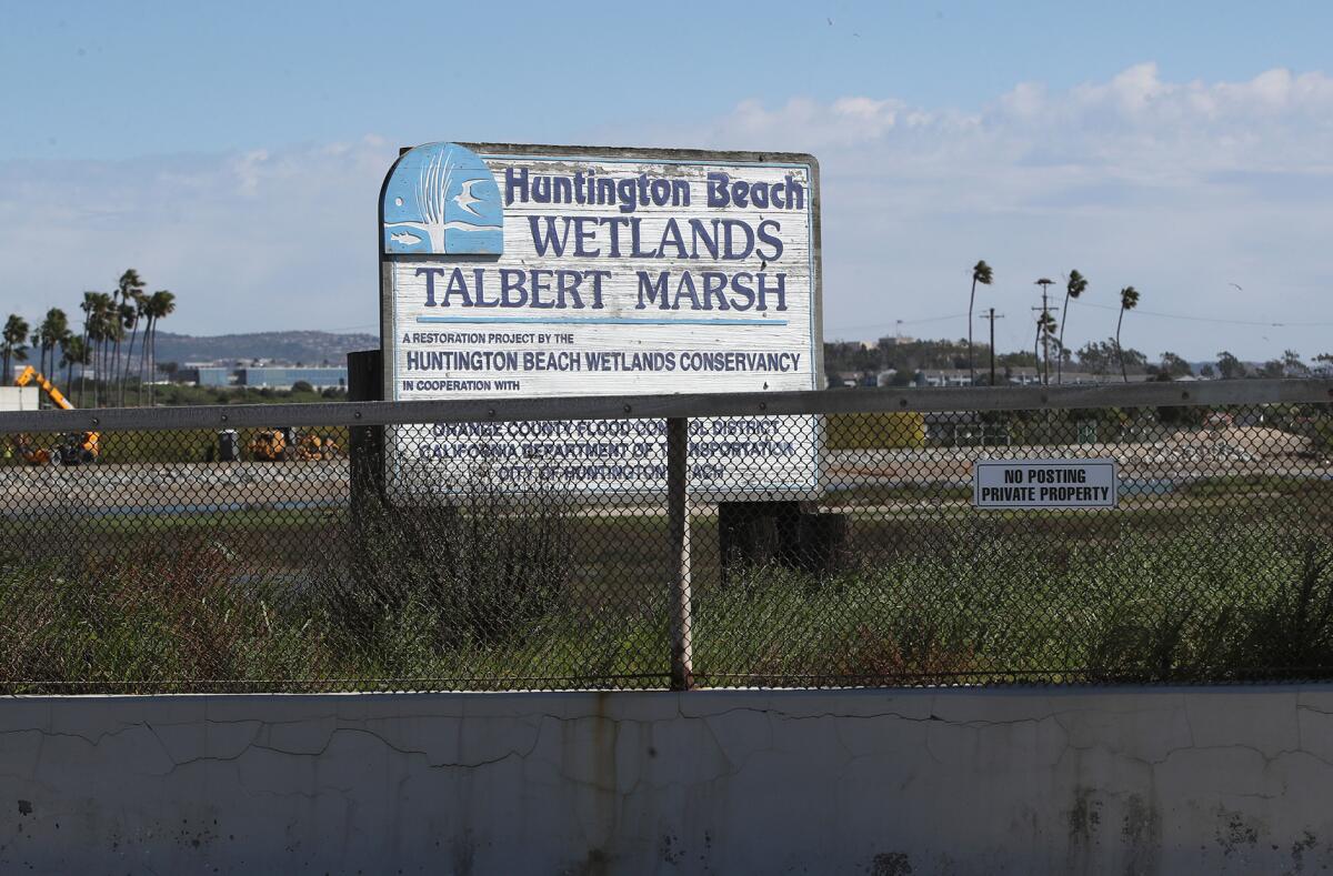 A sign indicates the location of Talbert Marsh, which makes up roughly 25 acres and stretches between Brookhurst and the Santa Ana River Channel.
