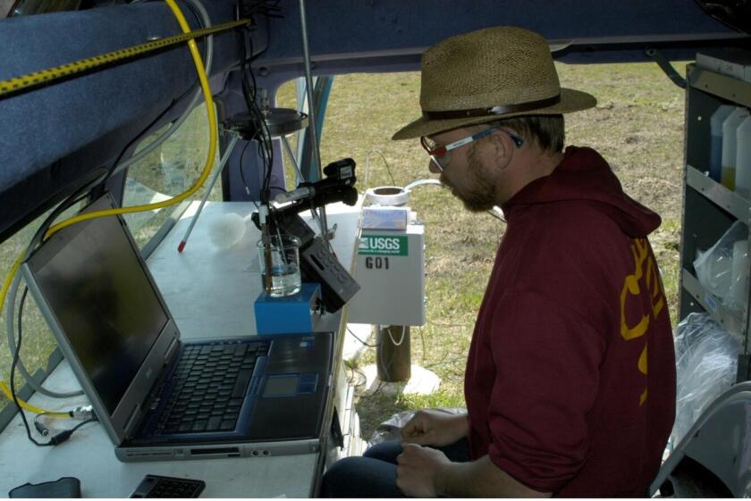 Tim Cowdery, a hydrologist for the U.S. Geological Survey who is now retired, assesses water alkalinity at Glacial Ridge National Wildlife Refuge while working in a mobile sampling van using an electronic field form in this undated photo.