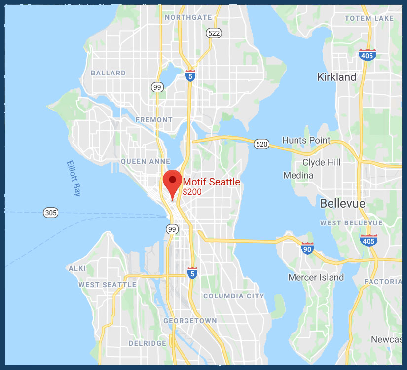 Location: Centrally located in downtown Seattle, the Motif Seattle Hotel is a boutique hotel that sits at the crossroads between premium shopping, stunning city landmarks, popular Seattle sports teams and venues, as well as music both past and present.